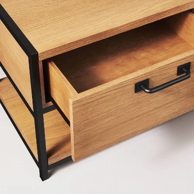 Add functional style to your indoor space with this Modular Entryway Storage Bench with Shelving from Hearth & Hand™ with Magnolia. This rectangular entryway storage bench strikes a clean-lined silhouette and boasts a neutral stained finish for a charming look that complements a variety of design aesthetics and color palettes. The top, two drawers and lower shelf provide space for everything from bags and backpacks to shoes and books. Place this bench in your living room or hallway as a convenient storage and display piece.