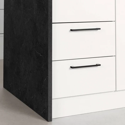 Brighten up your kitchen decor with this trendy, sophisticated Contemporary counter. Its slim metal handles and sturdy surface will add a clean, distinguished touch to your room. Another plus: the surface and sides of this piece are made of melamine, so they’re water and scratch resistant.