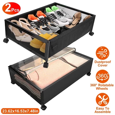 **Product Description:** Make the most of your under-bed space with these **2Pcs Under Bed Storage Containers**. Each container offers a generous **23.62 x 16.53 x 7.48-inch** storage capacity, ideal for keeping your home organized and clutter-free. Perfect for storing clothes, shoes, bedding, toys, and more, these storage drawers are designed to fit under beds, sofas, or closets, offering a discreet yet practical storage solution. The **clear dustproof cover** keeps your items protected from dust, dirt, and moisture, while the **transparent window** allows for easy viewing of contents.Equipped with **360° rotatable wheels**, these containers are easy to move in and out from under furniture, even on carpet or hardwood floors. The **upgraded wheels** are quiet, so you can move the containers without disturbing your family’s rest. Built with **thickened iron pipes**, these sturdy drawers can support up to **33 lbs**, ensuring long-lasting durability. The containers are easy to assemble with no extra tools needed, so you can set them up in just minutes.**Features:**- **Spacious & Convenient**: Each drawer offers ample space (23.62 x 16.53 x 7.48 inches), ideal for storing a variety of household items such as clothes, shoes, and bedding.- **Protective Dustproof Cover**: The breathable oxford cloth cover, combined with a clear window, keeps your items safe from dust, moisture, and mildew while allowing easy visibility.- **Smooth & Quiet Movement**: **360° rotatable wheels** ensure effortless movement on any surface, and the upgraded wheels operate quietly for minimal disruption.- **Durable & Sturdy**: Constructed with **thickened iron pipes**, each drawer supports up to 33 lbs, offering a solid, long-lasting storage solution.- **Quick & Easy Assembly**: No tools required for setup—simply follow the instructions, and your containers are ready to use in minutes.**Specifications:**- **Brand**: Newhome – **Material**: Iron, Oxford Cloth – **Color**: Black – **Load Capacity**: 33 lbs (15 kg) per drawer – **Item Dimensions**: 23.62 x 16.53 x 7.48 inches – **Item Weight**: 3.41 lbs (1.55 kg) per drawer – **Package Size**: 17.32 x 6.69 x 5.11 inches – **Package Weight**: 7.38 lbs (3348 g) **Package Includes**: – 2 x Under Bed Storage Drawers – 4 x Meshes – 2 x Cloth Covers – 24 x Tubes – 8 x Wheels – 1 x Wrench – 1 x User Manual Organize your bedroom, living room, or dorm room with these practical and sturdy **under-bed storage containers**. Ideal for maximizing storage space and keeping your home neat and tidy.