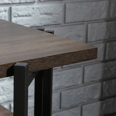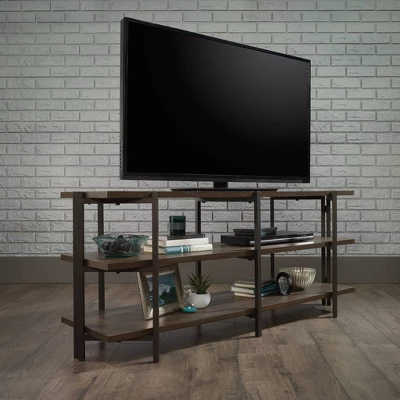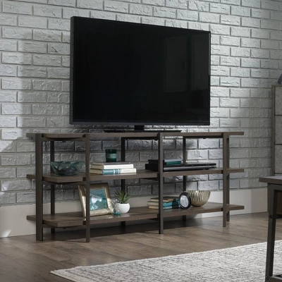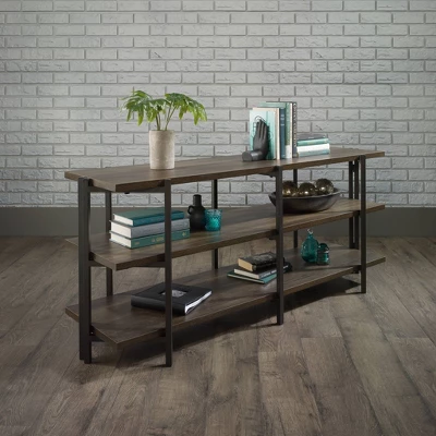 It’s time for an entertainment upgrade! Give your home the update that it needs without having to sacrifice on style with this credenza from the North Avenue collection. This TV credenza accommodates up to a 55″ TV, making it ideal for binge watching your favorite shows or playing endless hours of video games with your friends. This TV stand features sturdy 1″ thick top and shelves. Already have a TV stand? Use its spacious top surface to display home décor items like decorative plants and photos of your family and friends. Its two lower shelves are ideal for your video and gaming equipment or storing items like organizing bins and your collection of movies. Its durable, black metal frame ensures that it’s sturdy and built to last. This entertainment credenza is finished on all sides for versatile placement throughout any room in your home. Finished in Smoked Oak, this attractive credenza is just what your home is missing.