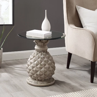 The pineapple is the symbol for hospitality and this piece is ready to continue the tradition. Incredible details with a stone texture, antiqued in shades of white and gray, capped off with a beveled glass top. Formed from an artist’s sculpture, use this accent table in a guest room, den or living room to hold a lamp or flower arrangement.