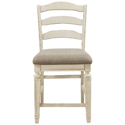 Bon appétit. With its rounded ladderback styling, chipped white finish and plushly cushioned seat, this counter-height bar stool has all the right ingredients for a French country-inspired feast for the eyes. Antiqued two-tone finish featuring chipped white with distressed wood finished tops. Signature Design by Ashley is a registered trademark of Ashley Furniture Industries, Inc.