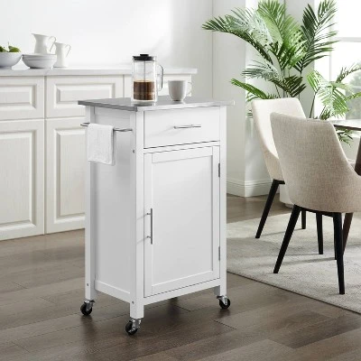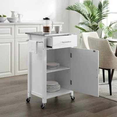 Organize your kitchen with the space-saving design of the Savannah Compact Kitchen Island/Cart. Ideal for adding extra storage and workspace, this island offers a sturdy stainless steel countertop and large cabinet with an adjustable shelf inside. The caster wheels on that base allow you to create a flexible food prep or serving space, while the full-extension drawer adds an ideal spot to tuck away everyday items. By adding a towel bar on one side and two utility hooks on the other, the Savannah Compact Kitchen Island addresses all your at-home chef needs.
