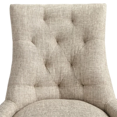 The Ariane (Set of 2) dining chairs by angelo:HOME will bring an upscale look to your dining area. These handsome tailored chairs are constructed of solid rubberwood in a weathered gray finish and upholstered in a neutral light gray linen type fabric. Accented with generously sized nailheads along the outer edge and tufted backs, these chairs will complement any dining room interior.
