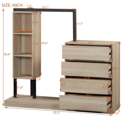 - Spacious Storage for All Belongings: Beyond open storage, the wardrobe features four roomy drawers and additional cabinets, offering ample space to accommodate all your belongings. Use the drawers for underwear, socks, or delicate items that need protection; the cabinets are ideal for bulkier items like shoes, seasonal clothes, or bedding. Whether you’re furnishing a master bedroom, guest room, or dressing area, this wardrobe’s generous capacity ensures you can store everything without sacrificing space or order.