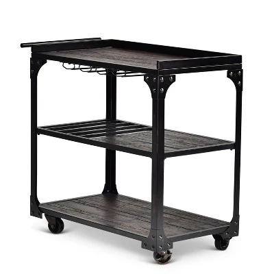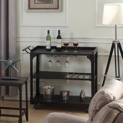 The Sherlock Server Cart from Steve Silver Co. is great for entertaining. The top is perfect for serving food and drink, and it features a stemware holder on the underside for wine glasses and champagne flutes. The middle tier features a wine rack that can hold four bottles and a small shelf, and a bottom shelf rounds out the cart with extra storage space.
