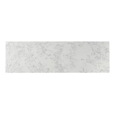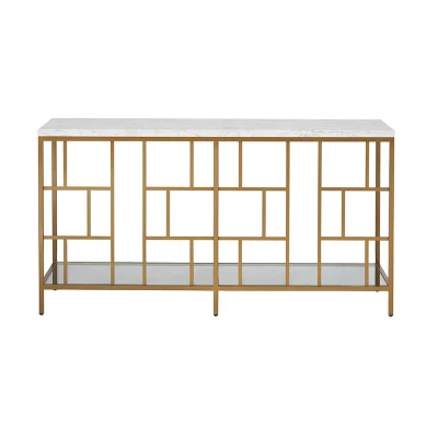 This delightful console features a light and airy geometric metal base with a soft gold powder finish that is complemented by our Starlight White marble top and tempered glass shelf. It is a functional piece of art that offers an easy way to change the look of any of your rooms.