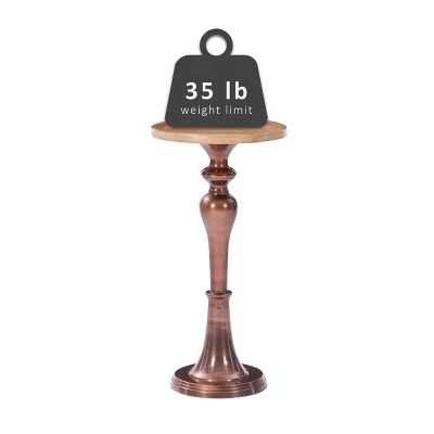 Upgrade your decor with this beautiful end table. The solid mango top and antique copper plated pedestal combine vintage looks with a modern accent. It nestles easily between living room chairs to make the perfect perch for your favorite drink. Set it in a bedroom corner to display a favorite photo or use as an elegant kitchen or bathroom stand. The round wooden tabletop is recessed to securely hold delicate vases or small potted plants. This unique piece is a splendid complement to virtually any furniture ensemble.