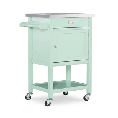 Equally at home in your kitchen or entertainment area, this efficient Kitchen Cart is a versatile accent. Slender legs frame a top drawer, cabinet space and bottom shelf, allowing you to store both cookware and serve ware for any setting. Easy roll casters provide smooth mobility if you’re scheduled to entertain guests or take full advantage of your space and use the stainless-steel top to house a small microwave oven.