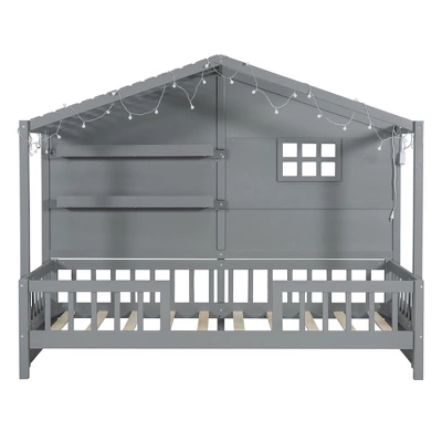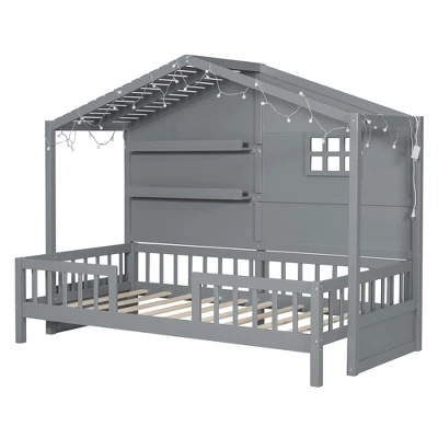 Transform your child’s bedroom into a magical retreat with this Twin Size House Bed. Featuring a charming house-shaped frame, this platform bed includes built-in shelves for ample storage, a delightful window for added charm, and a sparkling light strip on the roof to create a cozy and enchanting ambiance. The sturdy construction ensures safety and durability, making it a perfect blend of style, functionality, and comfort for your little one’s space.