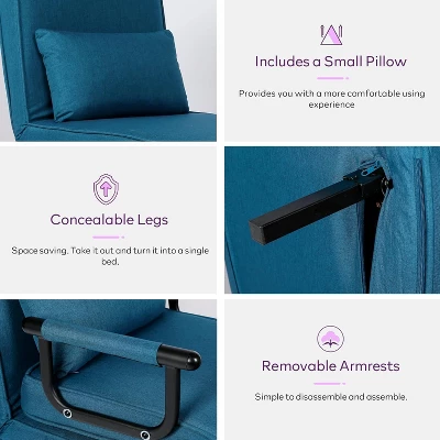 The TYBOATLE 5-in-1 Multifunctional Chair Bed seamlessly transforms from an accent chair to a chaise lounge, floor chair, single bed, or futon mattress with adjustable angles for ultimate flexibility. Crafted with a durable metal frame, soft high-quality sponge, and wear-resistant linen fabric, it offers comfort and stability up to 450 lbs. Perfect for small spaces like apartments, bedrooms, and offices, it features a compact, minimalist design, detachable parts for easy storage, and quick assembly in just minutes.