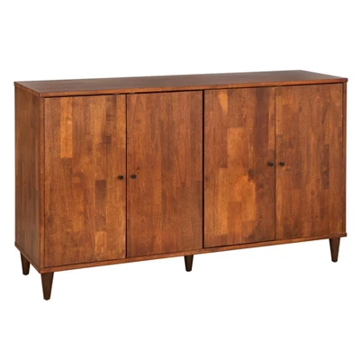 Impress your guests with The Vilas Buffet by Lifestorey. Defined with a simple silhouette and a refined design that will bring style and function to your home. This buffet features tapered cone shaped legs, four cabinet doors with two adjustable shelves inside each cabinet. Generous storage provides organization for dinnerware, serving pieces, linens, and more. It also features rear ventilation cut-outs for airflow as well as cord management opportunities for electronics and use as a TV stand. Multi-functional, this Mid-century cabinet is crafted of solid rubberwood and finished in a warm tobacco brown.