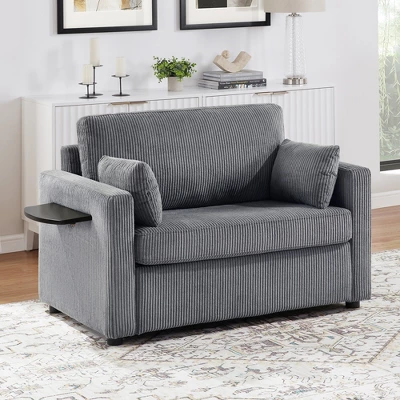 This versatile twin-size convertible sleeper sofa effortlessly transitions from a compact sofa to a comfortable bed, perfect for small apartments, guest rooms, or studio spaces. The smart design includes practical additions like a foldable side table for drinks or snacks, integrated USB charging ports for device convenience, and a side storage pocket to organize remotes or magazines. Two included lumbar pillows provide extra back support while adding a decorative touch. Whether used as a cozy reading nook, a workspace by day, or an instant guest bed at night, this multifunctional piece maximizes utility without sacrificing style. Its space-saving design and thoughtful features make it an excellent choice for modern living where flexibility and functionality matter most. The durable upholstery ensures lasting comfort through daily use and frequent transformations.