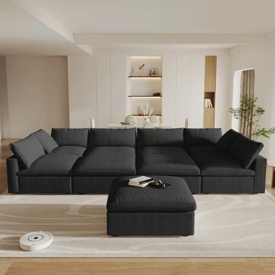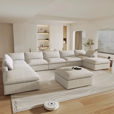 Modular Sectional Sofa with Thick Cushion, Minimalist Sofa Couch,Convertible Couch Deep Seat Couches for Modern Living Room Sofa Sets for Office House This Cloud Modular Sectional sofa is a unique sofa with an appearance resembling soft clouds and a texture that is also very soft and comfortable.What’s More, This sofa has a wide range of applications and can be easily integrated into different settings, whether it be a living room, study, lounge, or office. Its simple and generous design, with coordinated color schemes, is suitable for various decoration styles. 1. Washable Performance Fabric 2. Open Your Mind 3. Relex Your Body Shipping: We ship the goods from our warehouse in California and with Fedex/UPS shipping Specifications: Weight:320lbs Weight Capacity: 500 lbs / seat Seating Capacity: 32 Style: Modern & Contemporary Upholstery Material: Hemp Fabric Fill Material: Sponge£¬Fabric Cover Washable: Yes Assembly Required: Yes Note: Product Care: Dust regularly. Clean gently with a slightly damp cloth. Professional cleaning is recommended. Avoid direct sunlight and never apply or clean with harsh chemicals.
