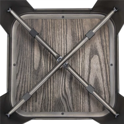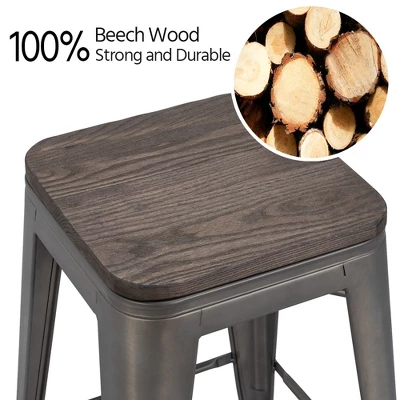 - Our counter height stools are constructed of heavy-duty metal stand coated with water- and rust-resistant paint and solid wood seat, providing durable and sturdy seats for home or commercial use, indoors or outdoors. Welded crossbars under seats attached with built-in tabs keep the seat surface free from scratches when stacked up. The stool legs are also covered with protective feet to avoid damaging the hard floor.