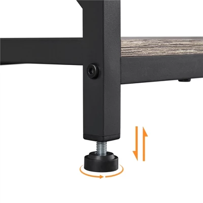 - Crafted with a sturdy steel frame, this piece uses superior particle board tabletop and shelves. The utility storage shelf offers four multi-sized shelves to organize your go-to kitchen needs like kitchenware or spice jars and smaller appliances like microwaves, coffee makers. The distressed brown color of this kitchen utility storage shelf can coordinate with a variety of styles, especially rustic barn-style and industrial design.